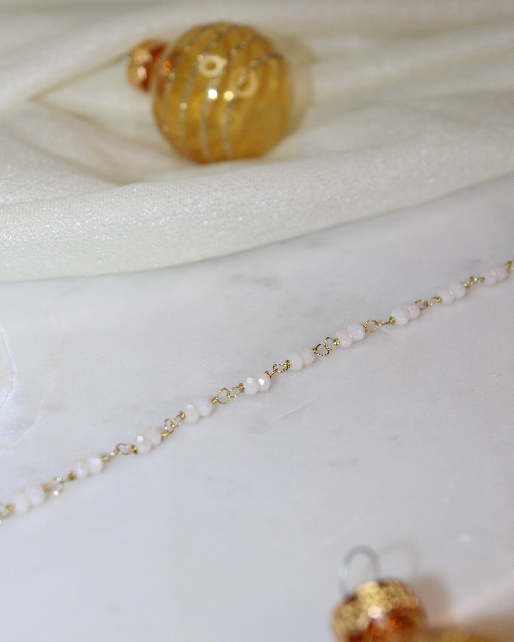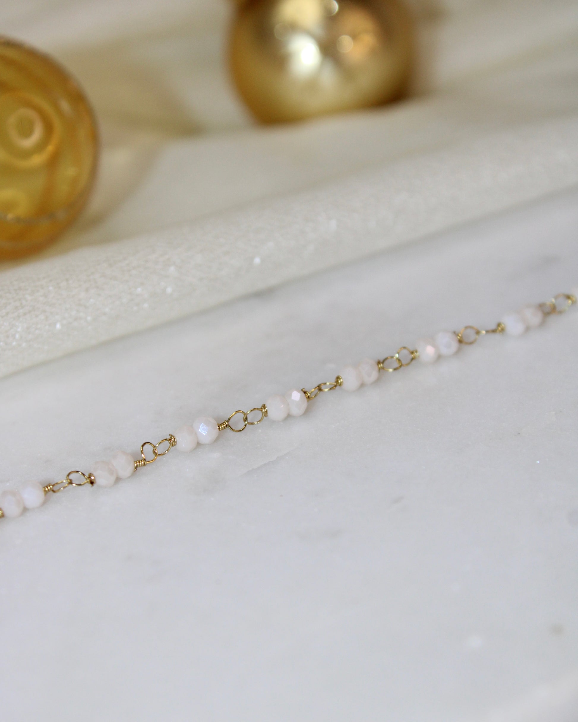 Le bracelet Angela est une succession de perles en verre blanches, deux par deux elles feront briller ton poignet en toutes circonstances 🌙✨